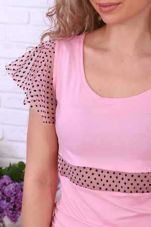 У данной футболки очень интересное дизайнерское решение: на уровне талии расположена полоса из сетки, а также рукава сделаны в форме воланов из сетки. Футболка приталена с округлым вырезом горловины. Она выполнена из вискозы плотностью 210 гр.