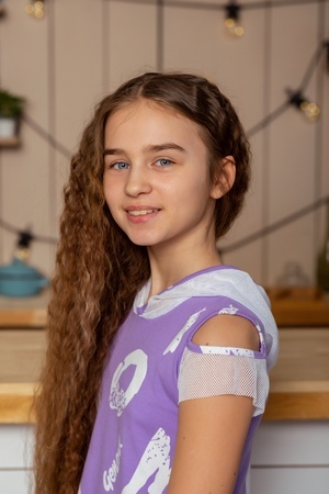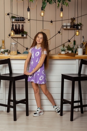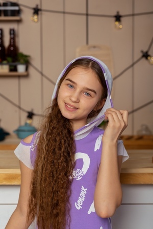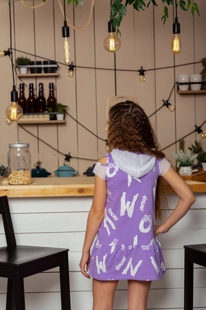 Платье длинной выше колена, с оборкой по низу, с капюшоном из сетки. Рукав короткий из сетки, с фигурным вырезом. Лицевой край капюшона, фигурные вырезы рукавов обработаны бейкой из основного полотна.