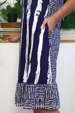 Платье женское, слегка расширенное к низу. Рукав втачной короткий с манжетой. Полочки из двух частей из ткани в полоску, вертикальные полосы на одной части, горизонтальные - на другой. Внутренние карманы в боковых швах. Спинка, рукав и рюша внизу из отделочной ткани в клетку. На моделях 48 и 52 размеры