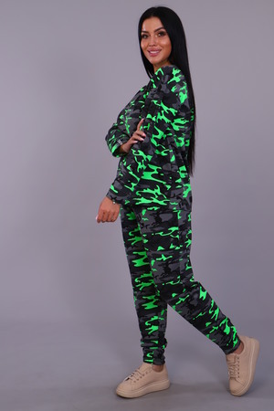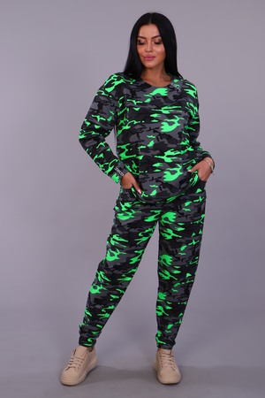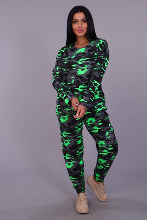 Женский брючный костюм из футера прямого силуэта. Брюки свободные, с внутренними карманами на передней части, толстовка с длинными рукавами без воротника, небольшая декоративная черная лента с белой надписью слева у горловины и на рукаве.