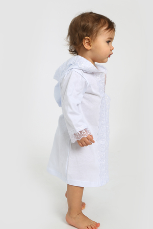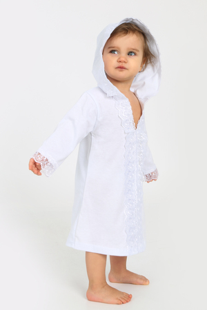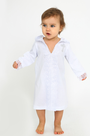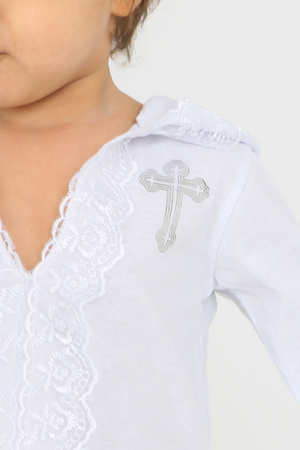 Крестильное платье для мальчиков и для девочек универсального белого цвета. Выполнена из натурального гипоаллергенного материала - 100% хлопок. Рубашка для крещения выглядит торжественно благодаря своей изящной отделке. Кружево обрамляет края рукава и горловину с капюшоном, также придаёт лёгкости данному наряду. Имеет символичный принт в виде серебряного крестика на груди. Платьице не раздражает нежную кожу Вашего малыша, подарит максимальный комфорт в Ваш светлый праздник. Послужит отличным подарком на Крестины (крещение ребёнка), выписку из роддома, день Рождения. ОБРАЩАЕМ ВАШЕ ВНИМАНИЕ, цвет на фото может отличаться от фактического оттенка за счёт различной цветопередачи устройств!