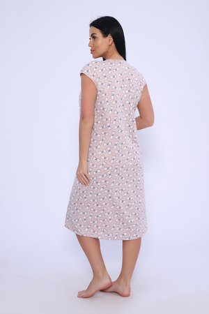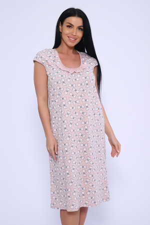 Женская сорочка из кулирки. Рукава очень короткие, окантовка, цветочный дизайн, две расцветки — розовая и шоколадная, общая длина приблизительно до коленей. Размеры от 44 до 62.