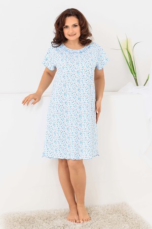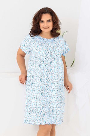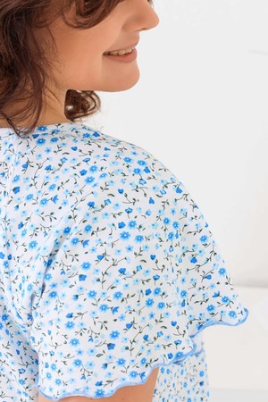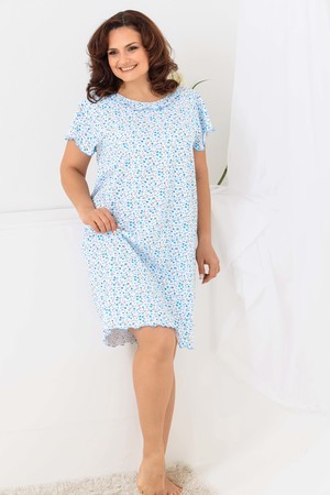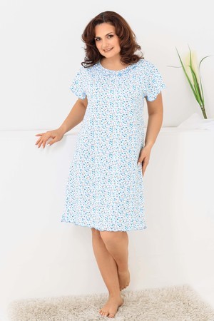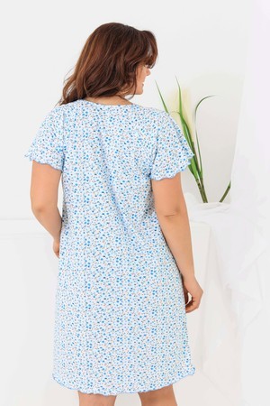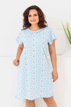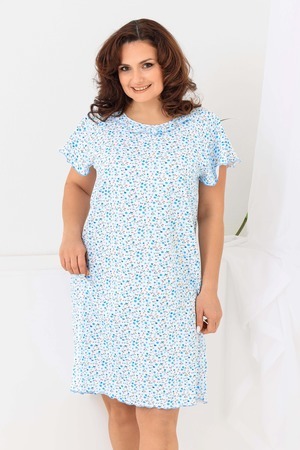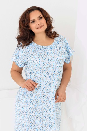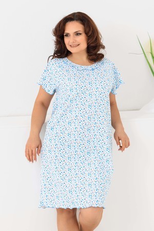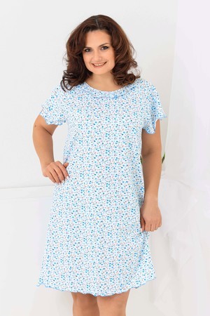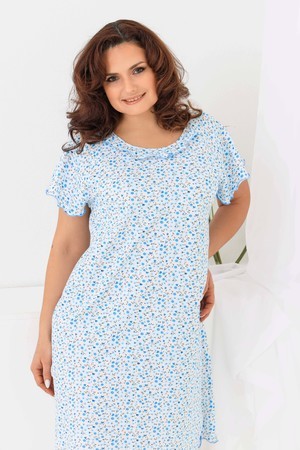 Сорочка женская с симпатичной рюшей по горловине. Очень свободный и удобный крой. Рукав-реглан не стесняет движения рук. Обработка рукава и низа изделия в виде лёгкой волны придаёт лёгкость и воздушность.