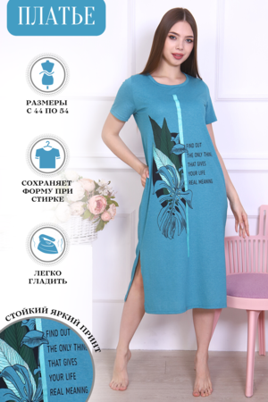 Платье женское из кулирного полотна, прямой силуэт, горловина круглая, рукав короткий, втачной, в боковых швах внутренние карманы, сбоку разрез, низ изделия обработан на плоскошовной машине, на полочке принт. Удобная модель для повседневной носки, а так же для прогулок и отдыха.