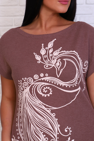 Туника женская с нежным принтом в виде жар-птицы, из трикотажного полотна СОТЫ. Модель полуприталенного силуэта, горловина в виде "лодочки" обработана обтачкой, спущенная пройма на широком манжете, в боковых швах удобные карманы. Низ спинки удлинён, по бокам небольшие разрезы. Трикотаж СОТЫ имеет оригинальный рисунок, образованный переплетением волокон, внешне напоминает пчелиные соты. Полотно мягкое, эластичное и прочное, легко стирается, практически не мнётся, не деформируется.
