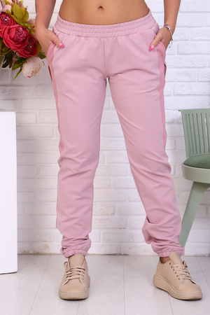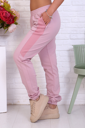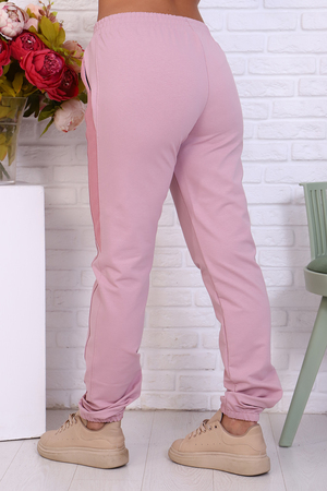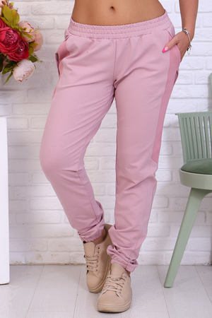 Брюки женские из футера 2-х нитка. Модель полуприлегающего силуэта на эластичном поясе с боковыми карманами. Вдоль бокового шва расположен лампас из отделочного полотна с фигурной вставкой, низ брюк обработан резинкой. Модель идеально подойдет для женщин, девушек как для дома, так и для прогулок.