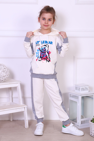 Костюм состоит из брюк с лампасами, низ обработан кашкорсе. Толстовка с печатью на полочке, с капюшоном, рукава и низ обработаны кашкорсе. На рукавах и полочке имеются вставки.