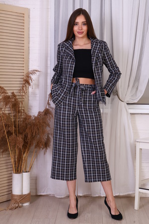 Костюм из легкой ткани с прямыми укороченными брюками пользуется большой популярностью среди женщин любого возраста. Прямой крой брюк подчеркнет достоинства и скроет возможные недостатки. Жакет с лацканами выполнен без подкладки, что позволит ему более мягко сесть по фигуре, а поясок подчеркнет талию.