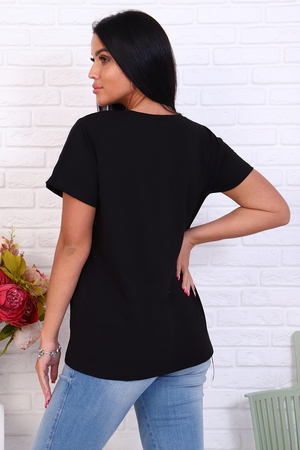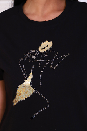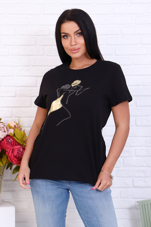 Футболка обычного кроя. Короткий рукав. Имеется декоративный элемент в виде страз: мужчина с женщиной танцуют танго. Выполнена футболка из кулирки: 100% хлопок, плотностью 140 гр