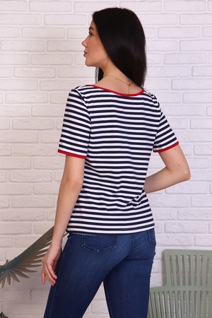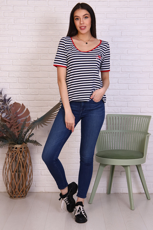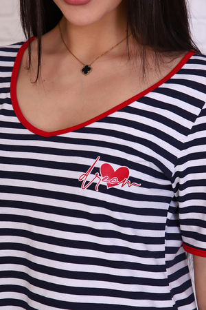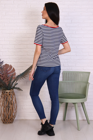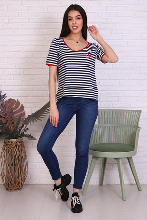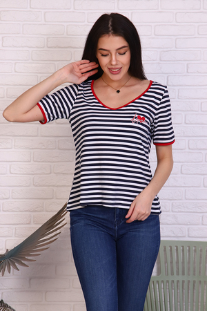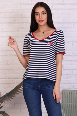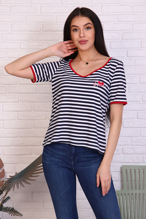 Футболка женская в полоску из кулирки с лайкрой. V-обрзаный вырез и рукава окантованы красной тканью. Печать на груди в виде сердечка с надписью в цвет окантовки. Прекрасный летний вариант. Сочетается с джинсами, шортами, пиджаком и юбкой.