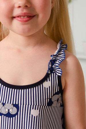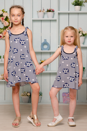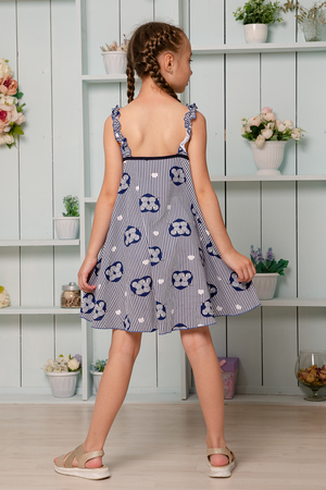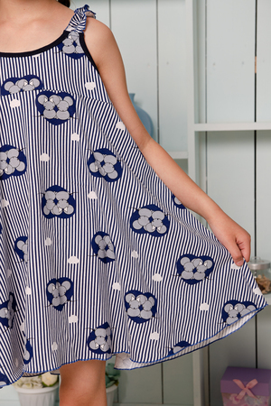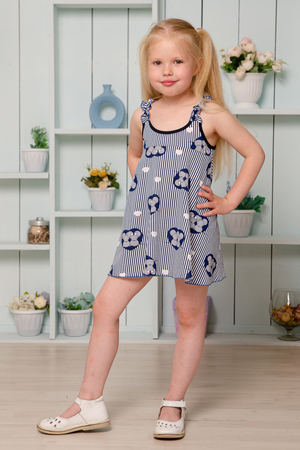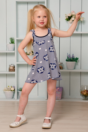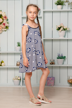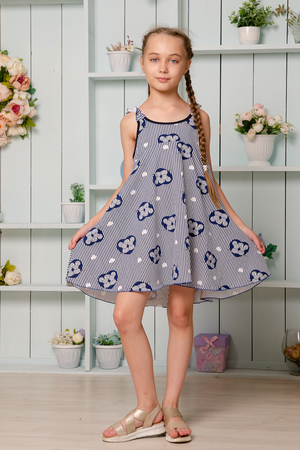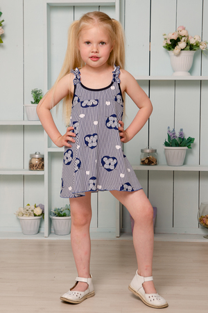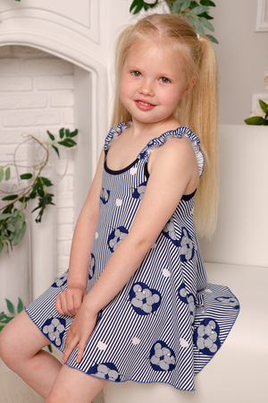 Сарафан детский летний, свободного силуэта с завышенной линией талии. Бретели выполнены из основной ткани собранной на тонкую резинку. Низ изделия обработан декоративной краеобметочной строчкой.