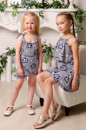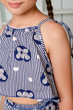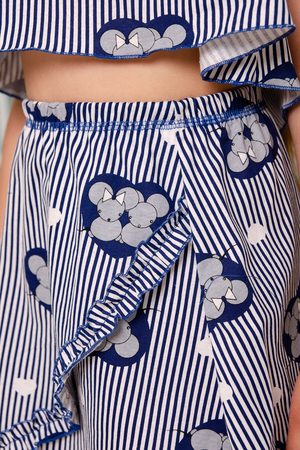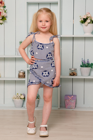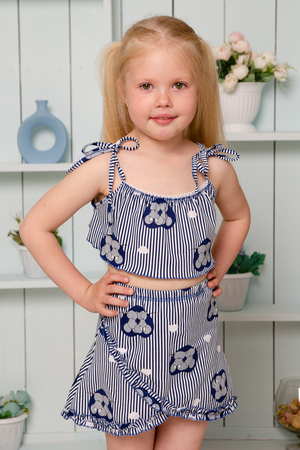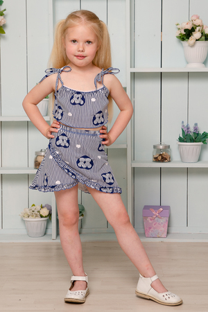 Костюм детский летний с юбкой и топом. Топ свободный на тонких брителях-завязках, которыми удобно регулировать длину изделия, горловина обработана декоративной ажурной резинкой, низ декоративной краеобметочной строчкой. Юбка расклешенная на запах, по всему нижнему контуру настрочена рюша.