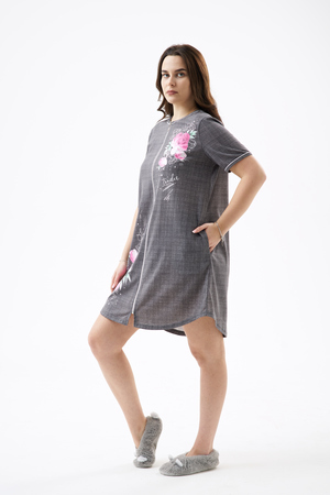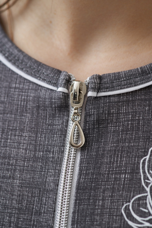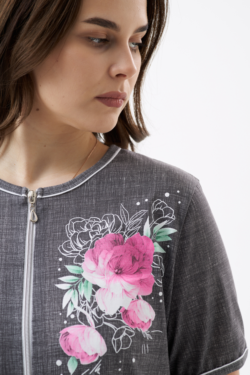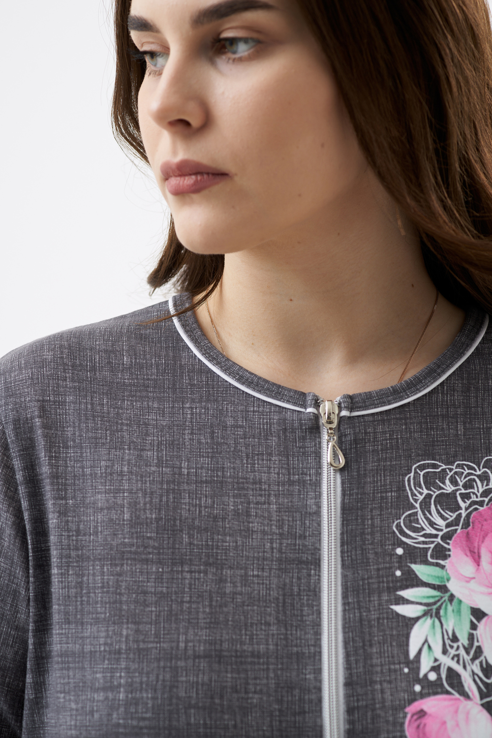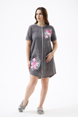 Халат женский полуприлегающего силуэта на молнии, с круглым вырезом горловины. Полочку изделия украшает цветочный принт, расположенный на груди и снизу изделия. Рукав короткий, втачной.