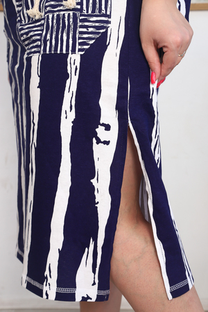 Платье женское полуприлегающего силуэта. Рукав цельнокроенный, спереди имитация реглана, сзади на спинке кокетка. На полочке накладные фигурные карманы, по боковым швам разрезы. Платье в морском стиле, этот образ подчеркнут благодаря использованию х/б шнура в кармане и рукаве, а также ткани в полоску с замечательным компаньоном клетка. На модели 52 размер. На фото платье из той же коллекции 9121