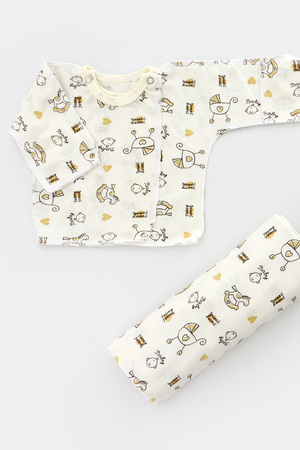 Замечательный набор из 5 предметов одежды, для новорожденного малыша - это отличный комплект в роддом. Все что нужно для первых дней только что появившегося на свет ангелочка! Антицарапки, пинетки, шапочка без завязок, распашонка трансформер на двух кнопках-застежках и большая пеленка 120х80 из нежнейшего трикотажного полотна - кулирка 100% хлопок. Эта ткань отлично впитывает влагу, воздухопроницаемая и гипоаллергенная, отличный выбор для нежной кожи малыша. Вашему малышу будет комфортно в таком комплекте.