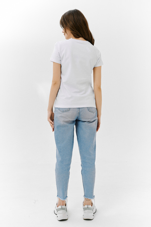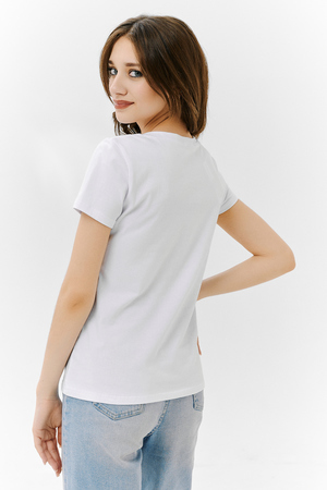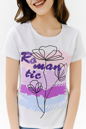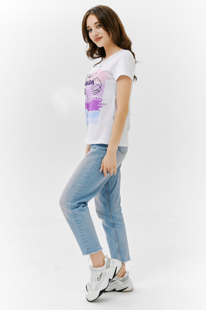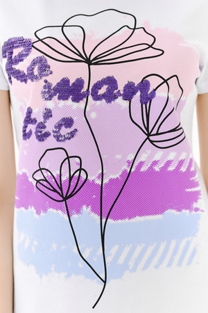 Футболка прямого силуэта, с округлой горловиной, длиной до середины бедра. Рукав втачной, короткий. Горловина обработана обтачкой из основного полотна. На полочке эффектная шелкография с переливающимися пайетками
