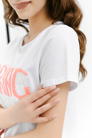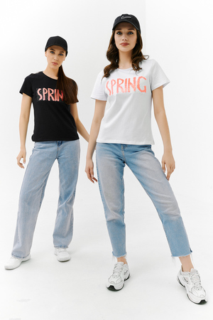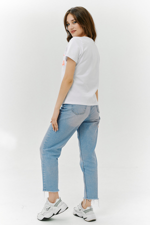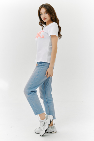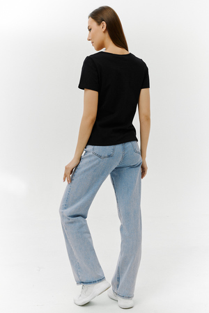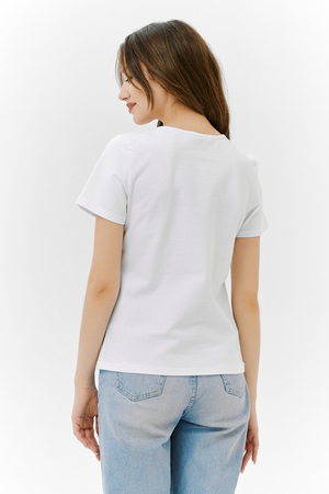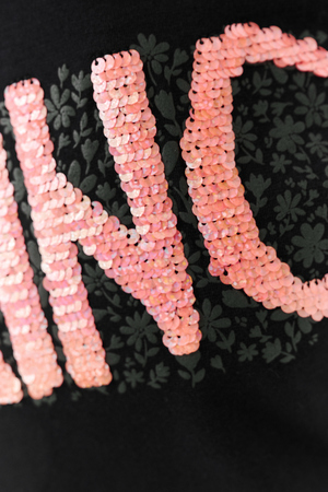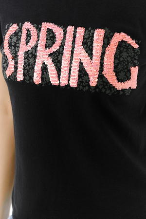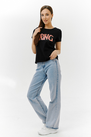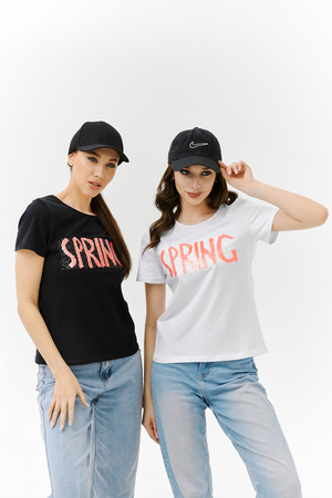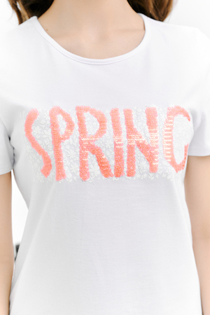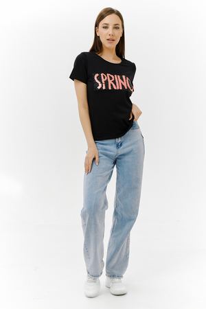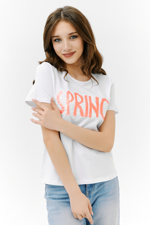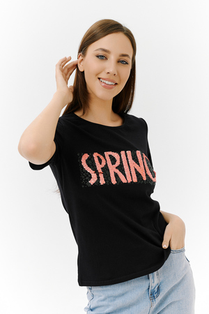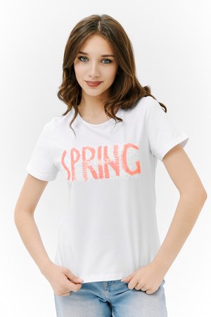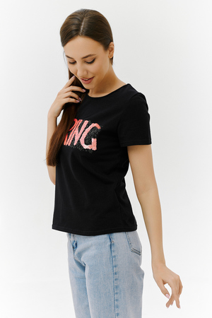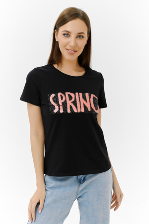 Футболка прямого силуэта, с округлой горловиной, длиной до середины бедра. Рукав втачной, короткий. Горловина обработана бейкой из основного полотна. На полочке эффектная переливающаяся аппликация с пайетками