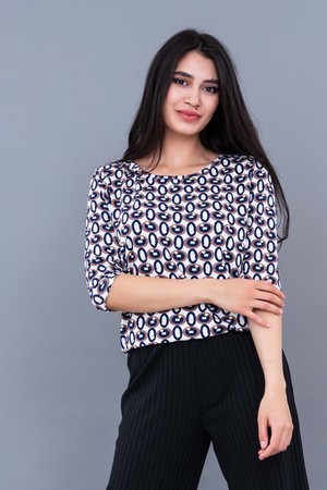 Джемпер женский выполнен из набивной вискозы в двух расцветках. Округлая горловина, рукав 3/4, на спинке вырез в виде капельки. Изделие присборено к низу и обработано бейкой. Набивка в виде абстракции придает изюминку базовой модели. Комфортный, универсальный джемпер прекрасно впишется в гардероб каждой модницы. Беспроигрышный вариант на любой случай.