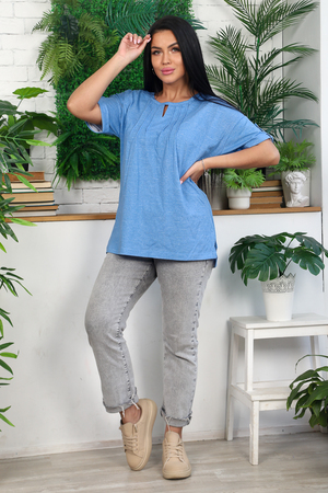 Туника прямая, свободная, с округлой горловиной, с удлиненной спинкой. Рукав короткий, с манжетом и хлястом с пуговицей. В верхней части полочки обработаны декоративные защипы. Спинка с кокеткой. В нижней части боковых швов расположены разрезы. Горловина обработана бейкой из основного полотна.