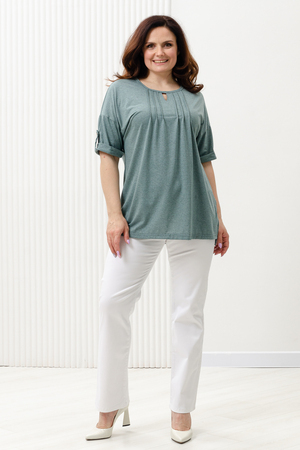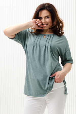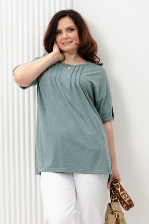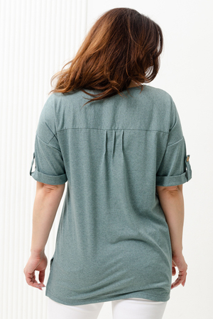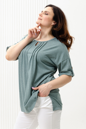 Туника прямая, свободная, с округлой горловиной, с удлиненной спинкой. Рукав короткий, с манжетом и хлястом с пуговицей. В верхней части полочки обработаны декоративные защипы. Спинка с кокеткой. В нижней части боковых швов расположены разрезы. Горловина обработана бейкой из основного полотна.
