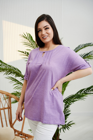 Туника прямая, свободная, с округлой горловиной, с удлиненной спинкой. Рукав короткий, с манжетом и хлястом с пуговицей. В верхней части полочки обработаны декоративные защипы. Спинка с кокеткой. В нижней части боковых швов расположены разрезы. Горловина обработана бейкой из основного полотна.
