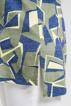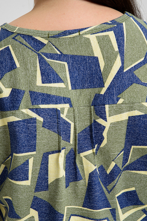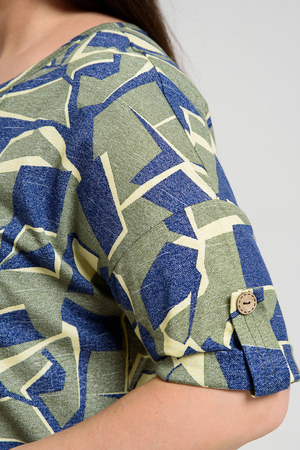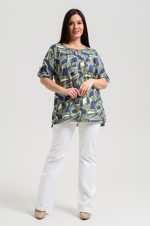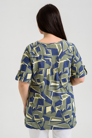 Туника прямая, свободная, с округлой горловиной, с удлиненной спинкой. Рукав короткий, с манжетом и хлястом с пуговицей. В верхней части полочки обработаны декоративные защипы. Спинка с кокеткой. В нижней части боковых швов расположены разрезы. Горловина обработана бейкой из основного полотна.