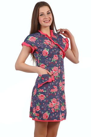 Женский запашной халат выполнен из 100% хлопчатобумажного полотна. Изделие полуприлегающего силуэта дополняют красивые оборки по горловине, рукавам и накладному карману. Данная модель прекрасно подойдёт для дома, дачи и отдыха неся в себе яркие нотки расцветки.