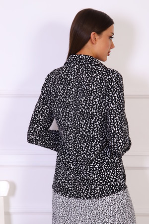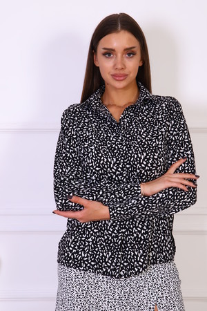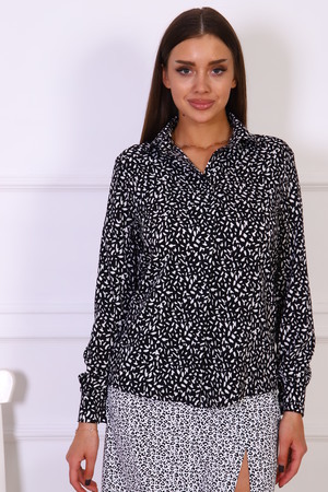 Блузка-рубашка с длинными рукавами на манжетах. По бокам блузки выполнены разрезы. Спереди потайная застежка
