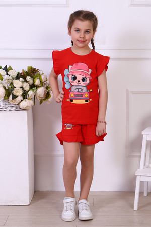Комплект состоит из шорт и футболки. На изделии имеется печать как на шортах, так и на футболке. Низ шорт и пройма футболки обработаны рюшами. Очень стильный и удобный. Ваш ребенок будет очень доволен.