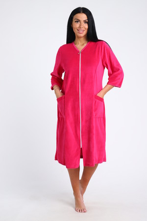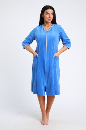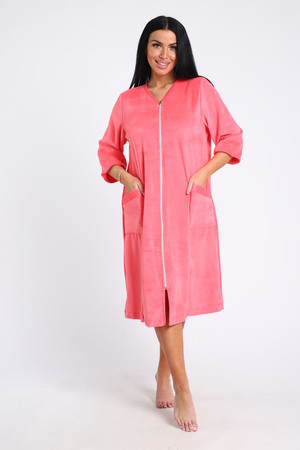 Халат женский велюровый, однотонный. По переду рельефы в рельефах карманы. Халат на молнии горловина уголком. Обработан халат под окантовку, длина ниже колена.