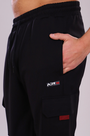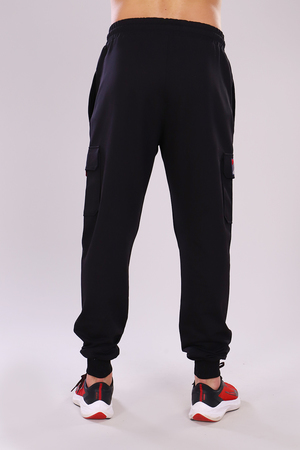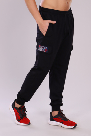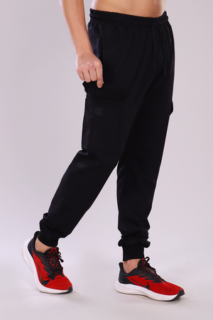 Брюки мужские с карманами с клапаном по бокам. Пояс на резинке со шнурком. Низ брюк на манжете. Слева над карманом печать, справа на клапане кармана пришит шеврон. Брюки изготовлены из ткани 2-х нитка с полиэстером