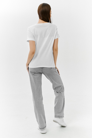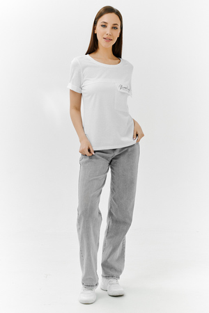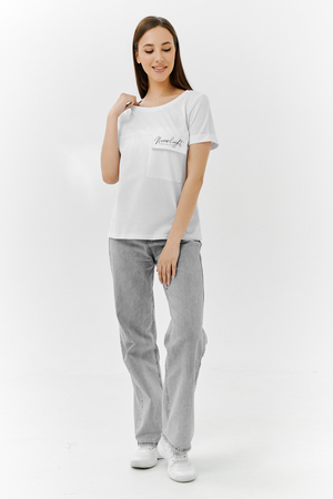 Футболка прямого силуэта, с округлой горловиной, длиной до середины бедра. Рукав втачной, короткий, с отворотом. На полочке расположен накладной карман с клапаном. Горловина обработана обтачкой из эластичного полотна.