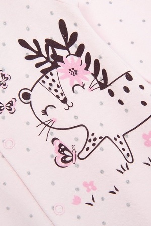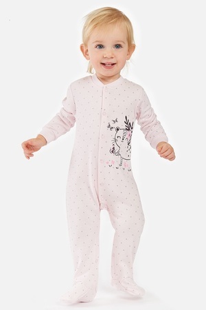 Комбинезон для девочки светло-розового цвета, декорирован принтом с блёстками. Ткань 100% хлопок. Застёжка на пуговицы-кнопки по всей длине изделия. Модель с длинным рукавом. Закрытые ножки. Рукавички-антицарапки в размерах 50, 56, 62 см. Швы на лицевую сторону в размерах 50, 56 см