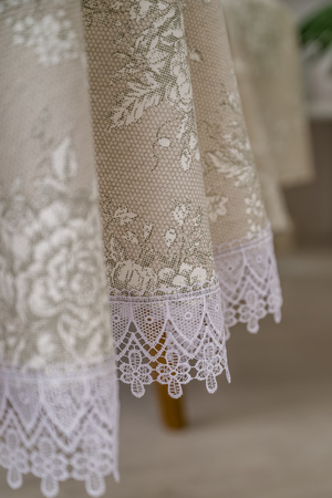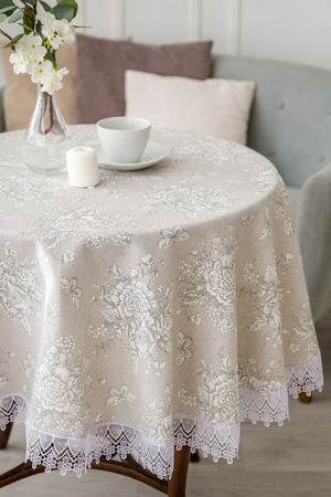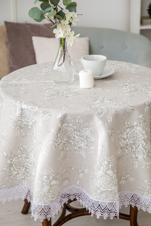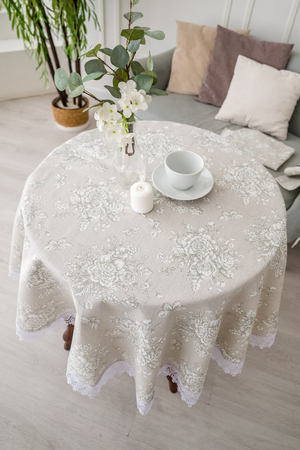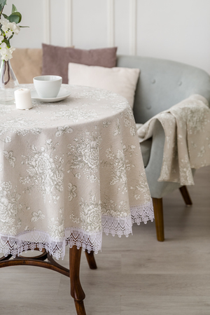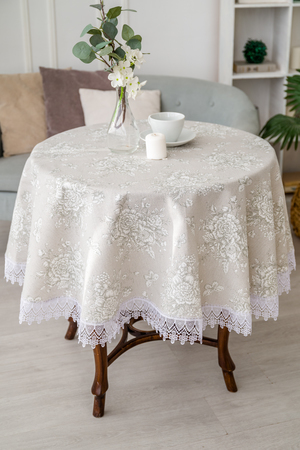 Круглая хлопковая скатерть отлично впишется интерьер любой кухни и станет главным украшением стола. Скатерть из рогожки повышенной плотности обработана кружевом по краю. Диаметр скатерти по ткани 150 см, плюс кружево шириной 8-10см.