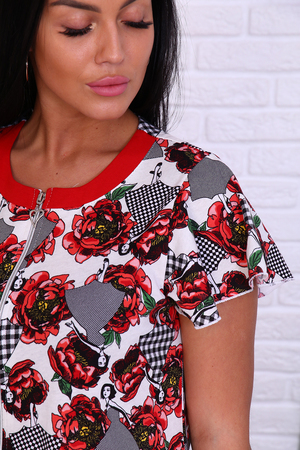 Халат женский домашний из кулирки с принтом длиной ниже колен. Халат полуприталенного силуэта с рельефами. Халат с центральной застежкой на тесьму-молнию. Перед с круглым вырезом и круглым воротником из отделочного однотонного материала с рельефами из линии проймы. С двумя симметричными карманами. Вход в карман прямой из ткани отделки. Рукава втачные короткие.