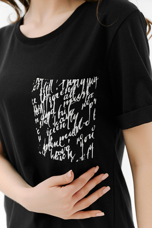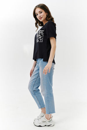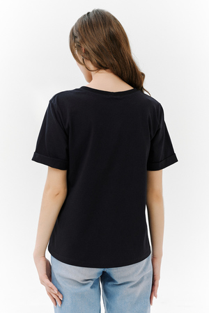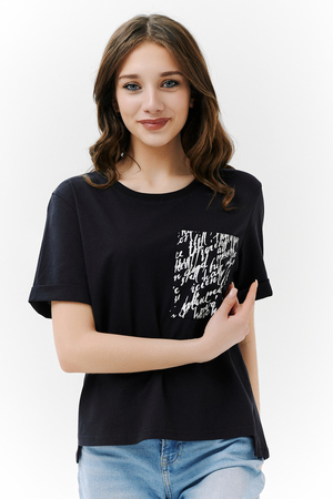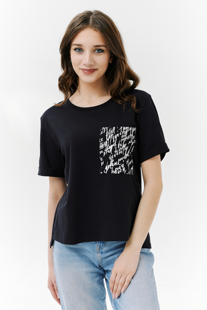 Футболка прямого силуэта, с округлой горловиной, с фигурной линией низа, длиной до середины бедра. Рукав втачной, короткий, с отворотом. На полочке расположен накладной карман. Горловина обработана обтачкой из эластичного полотна.