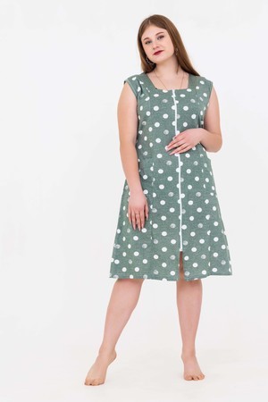 Халат женский из 100% хлопка на молнии, без рукава. С двумя накладными карманами. На спинке изделия 2 полупояса. Пройма обработана кантом. Низ изделия - плоский шов.