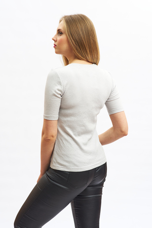 Футболка женская приталенного силуэта, длиной до середины бедра. Вырез горловины - округлый. Рукав втачной, удлиненный.