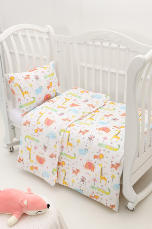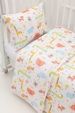 Комплект постельного белья с простыней на резинке на прямоугольный матрас размером 120х60см в детскую кроватку, из яркой современной расцветки. Бязь 100% хлопок. Размер пододеяльника 110х148см, наволочка 40х60см. Ткань абсолютно гипоалергенна. Материал высокого качества сохраняет форму и легко стирается. Хлопок обеспечивает отличную терморегуляцию и воздухообмен, чтобы малыш не потел. Ваш ребёнок всегда будет чувствовать себя комфортно и уютно