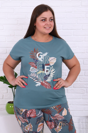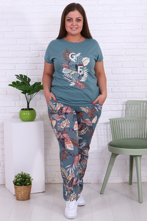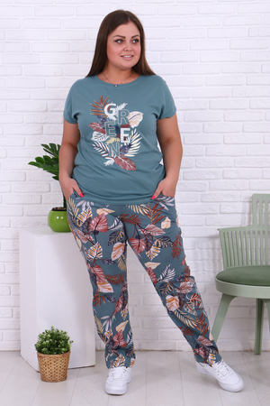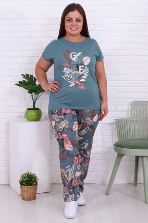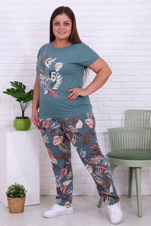 Костюм состоит из брюк и футболки со спущенным рукавом. Пижама полуприлегающего силуэта, выполнена из мягкого трикотажа (100% хлопок). Этот костюм прекрасно подойдет как повседневная домашняя одежда.