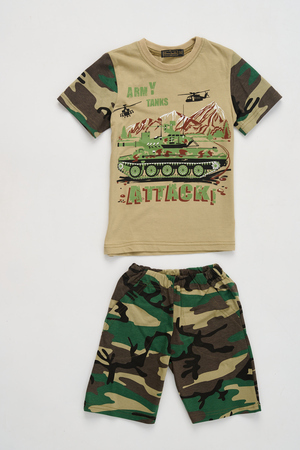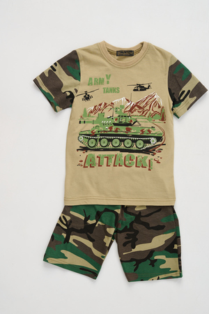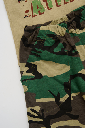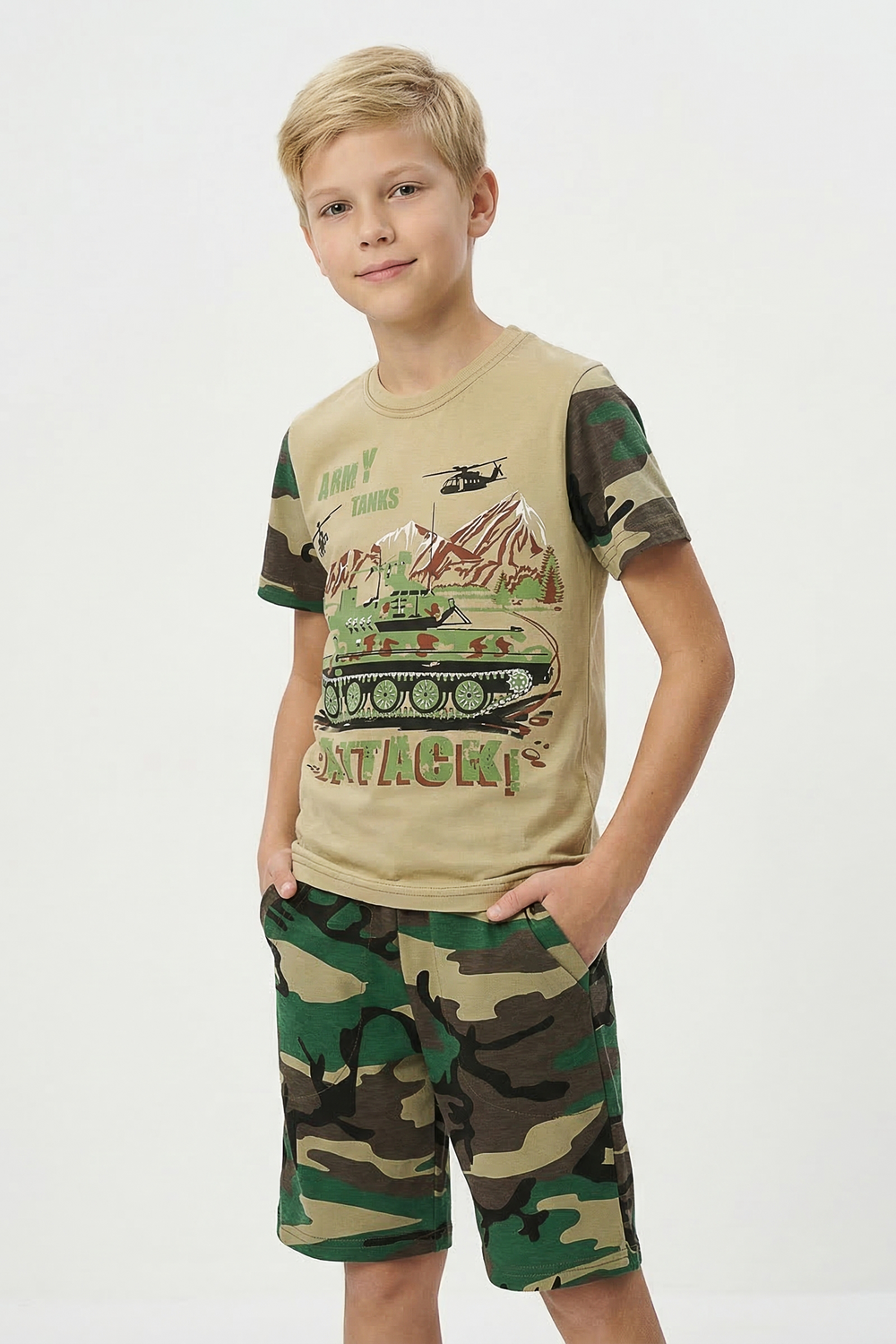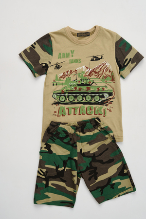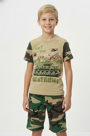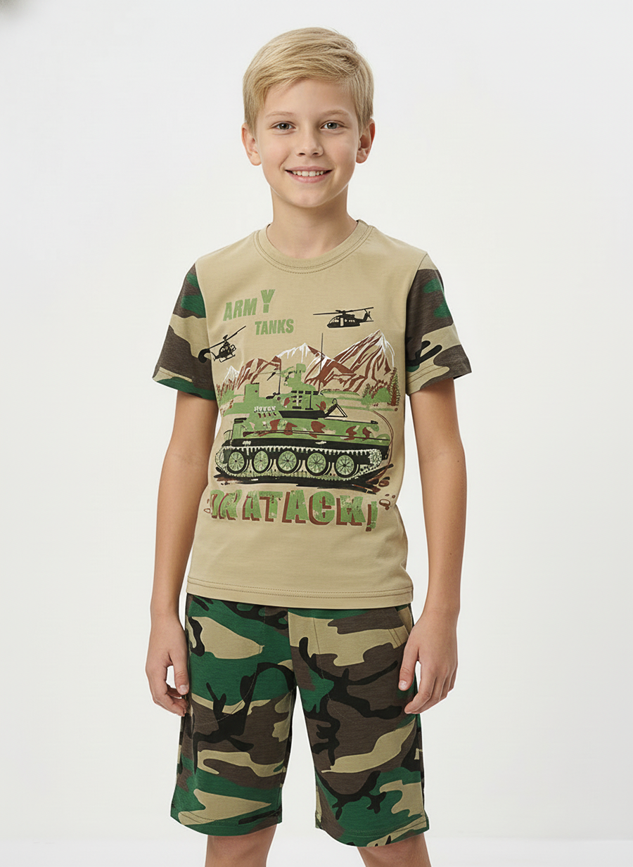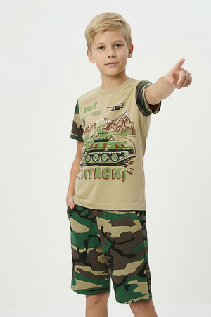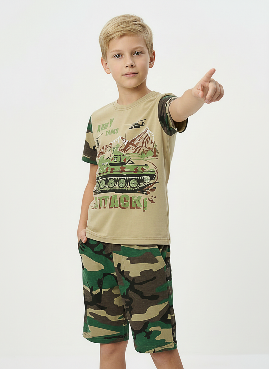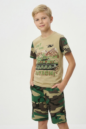 Костюм из кулирки для мальчиков футболка + шорты. Две расцветки — пиксель и флора. Футболка с принтом в виде БМД, рукава камуфлированные. Шорты аналогичного камуфляжного дизайна, по бокам карманы, длина до коленей. Может быть парой мужскому костюму Десант (продается отдельно). Размеры от 26 до 38.