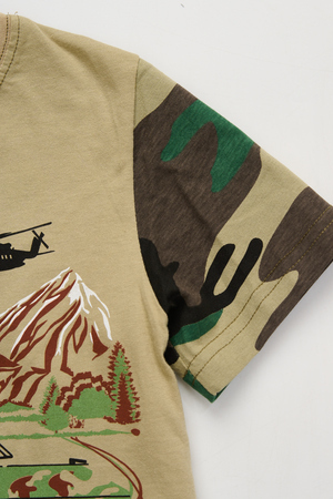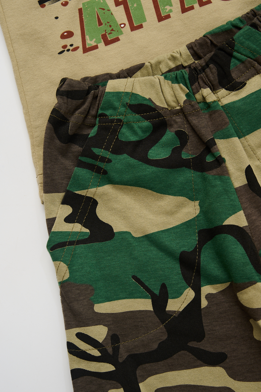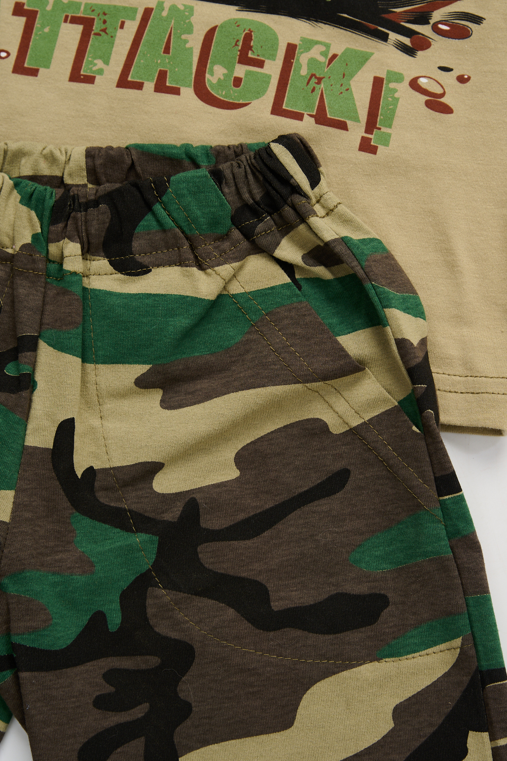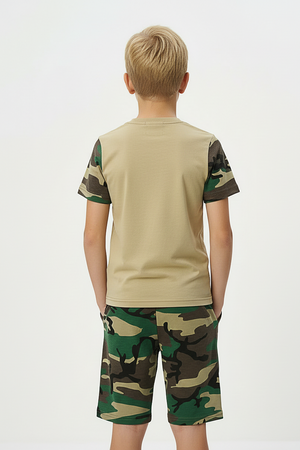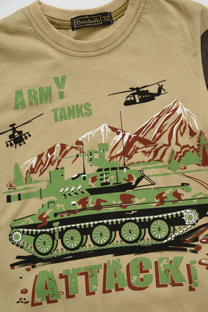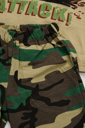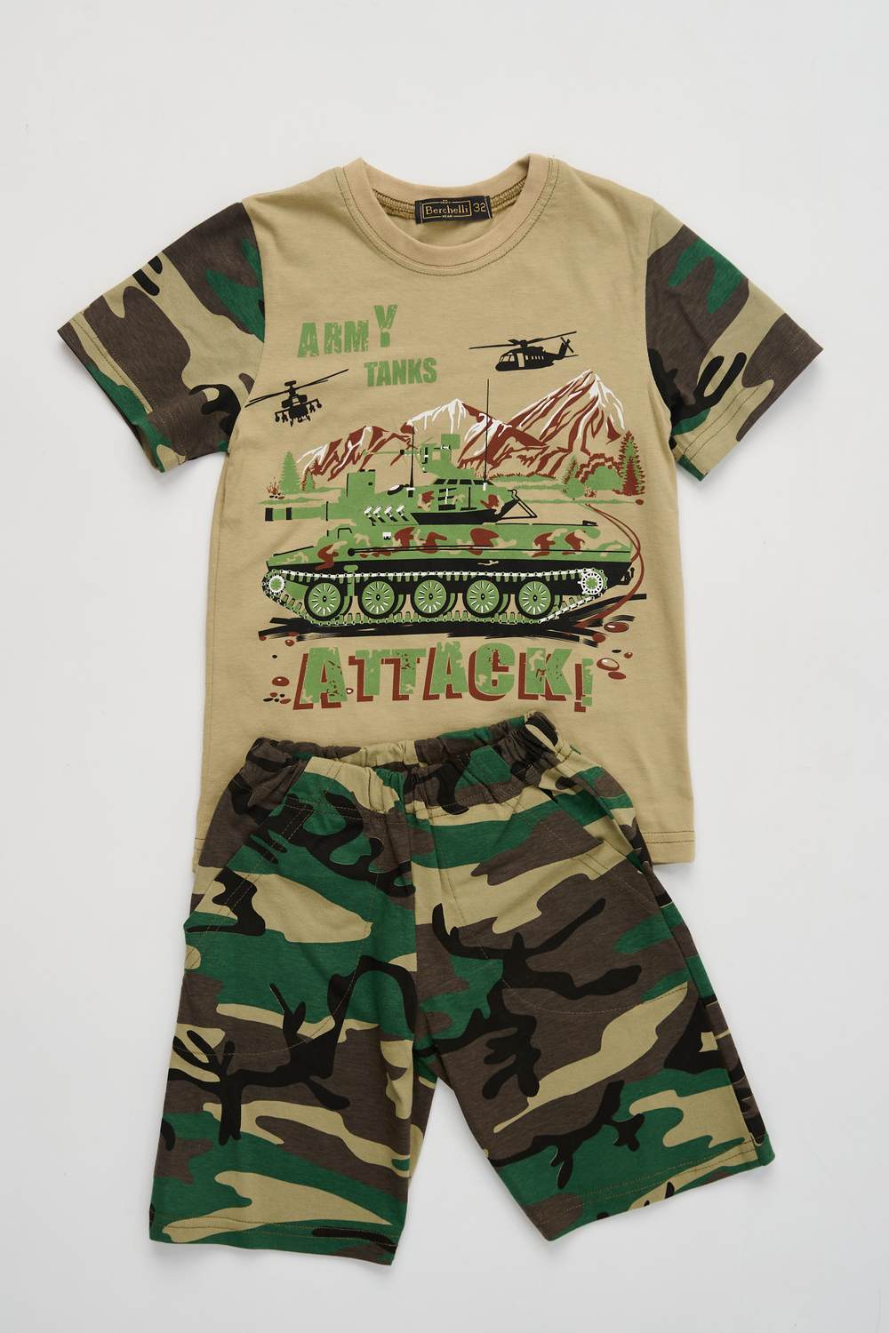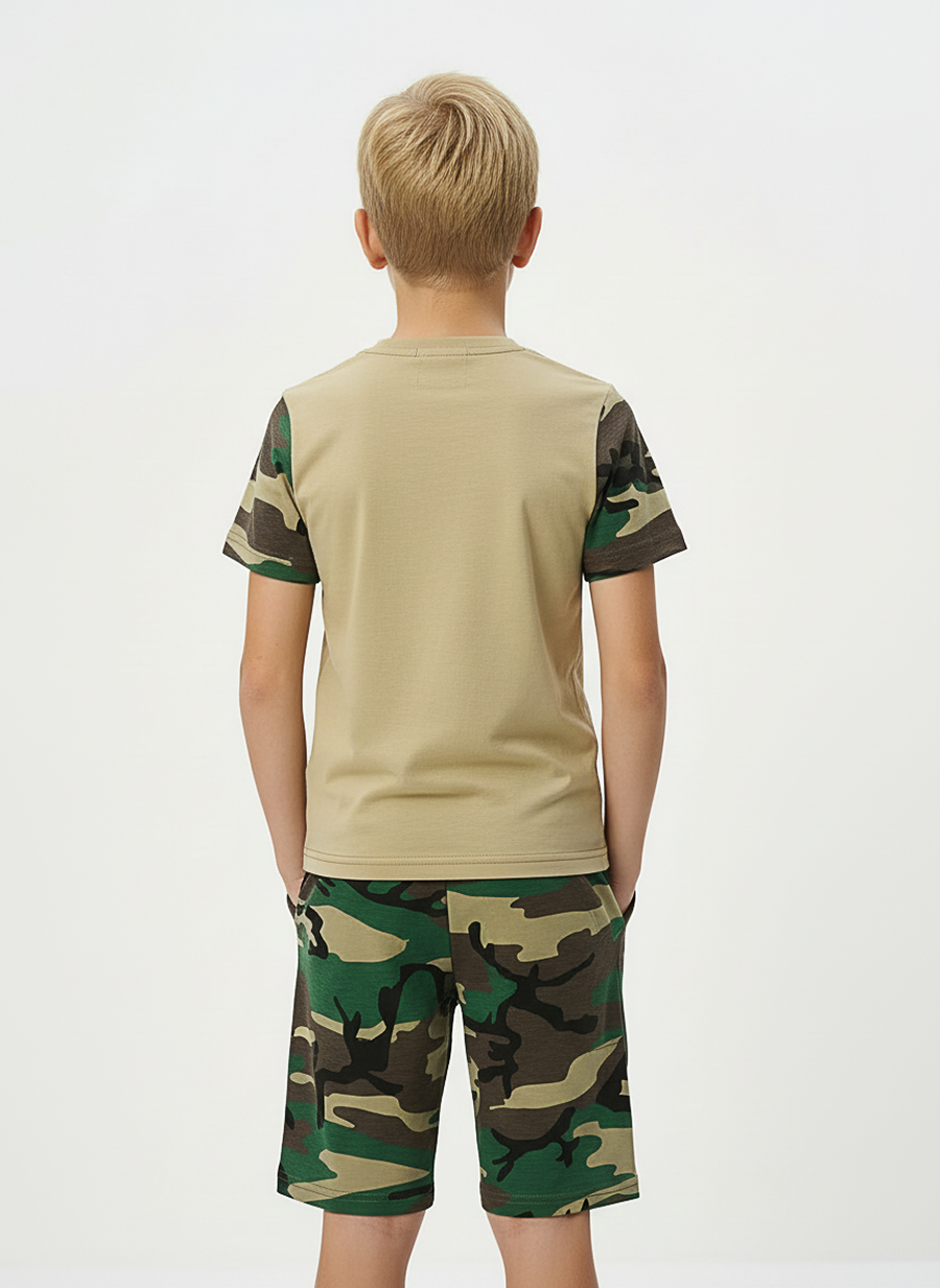 Костюм из кулирки для мальчиков футболка + шорты. Две расцветки — пиксель и флора. Футболка с принтом в виде БМД, рукава камуфлированные. Шорты аналогичного камуфляжного дизайна, по бокам карманы, длина до коленей. Может быть парой мужскому костюму Десант (продается отдельно). Размеры от 26 до 38.