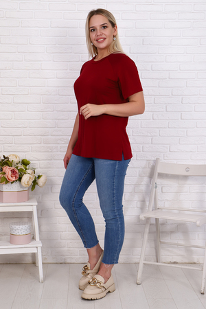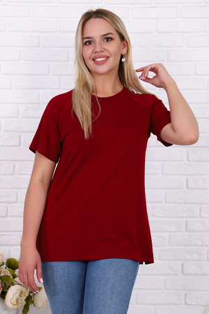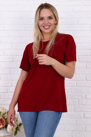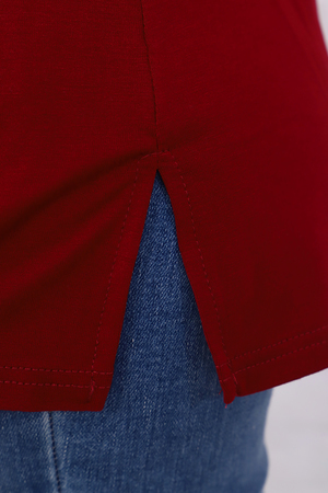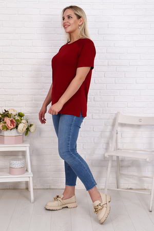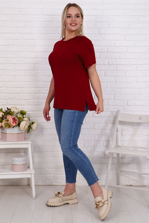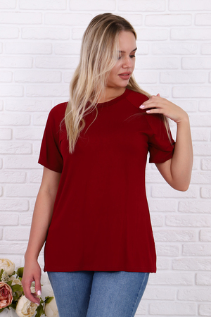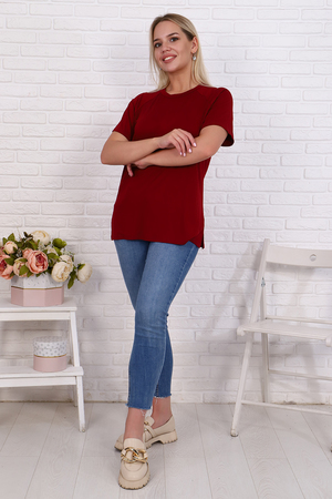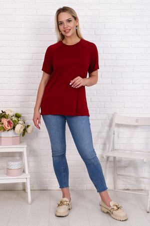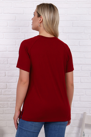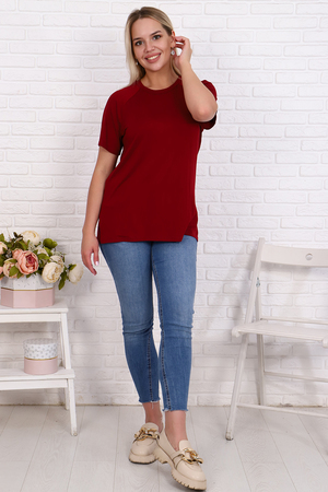 Футболка свободного силуэта имеет разрезы по бокам, рукав - реглан и круглый вырез горловины. Свободный стиль позволяет скрыть недостатки, придает шарм и уверенность. Модель будет отлично смотреться в комбинации как с джинсами, так и короткой юбкой.