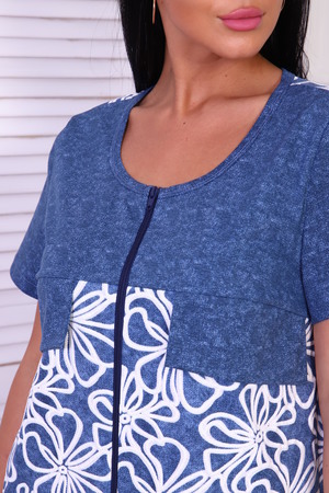 Халат женский, комбинированный из тканей под джинс и синей с белыми контурными цветами. Халат на молнии, два декоративных клапана на груди и 2 кармана в боках, горловина обработана окантовкой.