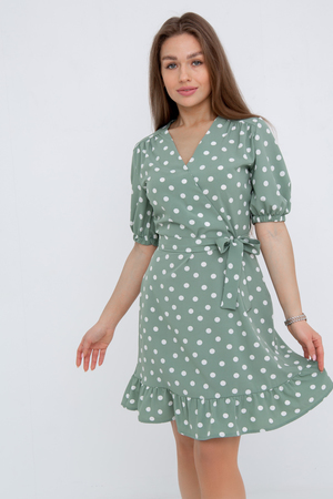 Платье с поясом из ткани суперсофт. Лиф платья на запах, на плечах кокетки, из-под которых выполнена сборка. Юбка платья слегка расклешена, по низу оборка. Рукав пышный, снизу на резинке.