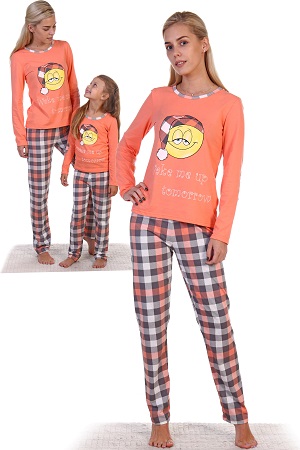 Костюм из кулирки футболка с длинным рукавом + брюки. Принт в виде смайла в колпаке и надписи. Брюки клетчатые. Может быть парой детскому костюму Дочка (продается отдельно)