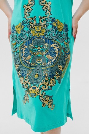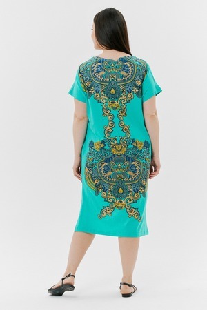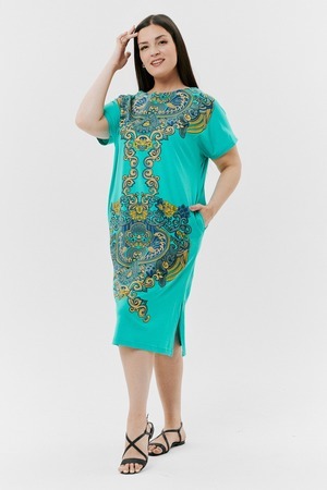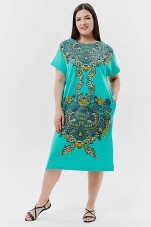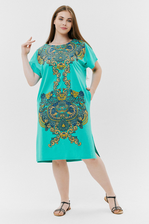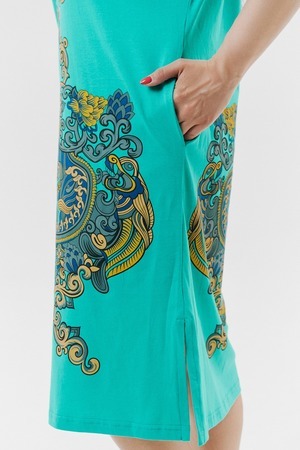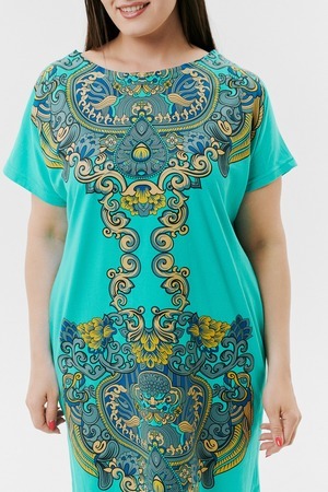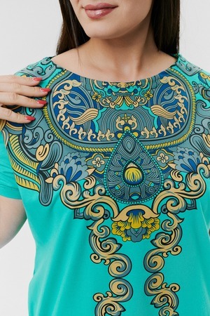 Туника женская прямого силуэта, рукав цельнокроенный короткий, в боковых швах внутренние карманы, внизу - разрезы. На полочке и спинке принт.