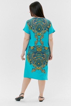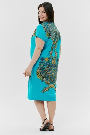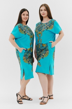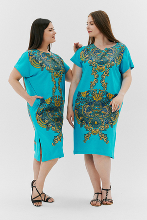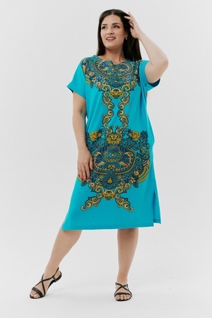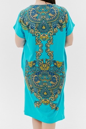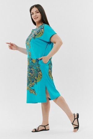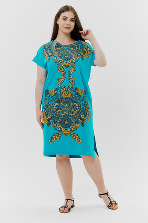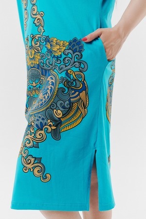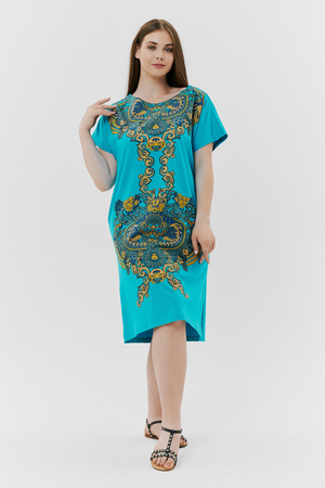 Туника женская прямого силуэта, рукав цельнокроенный короткий, в боковых швах внутренние карманы, внизу - разрезы. На полочке и спинке принт.