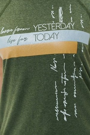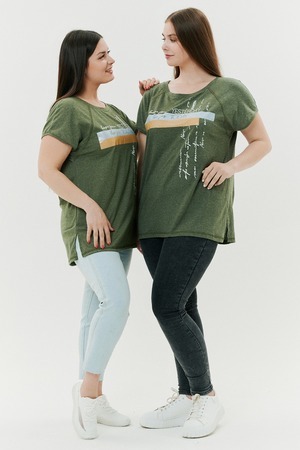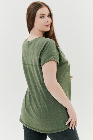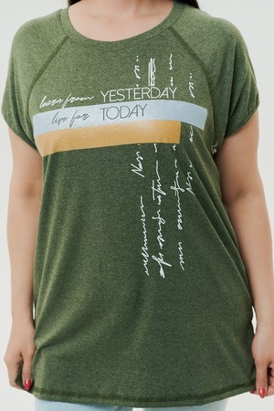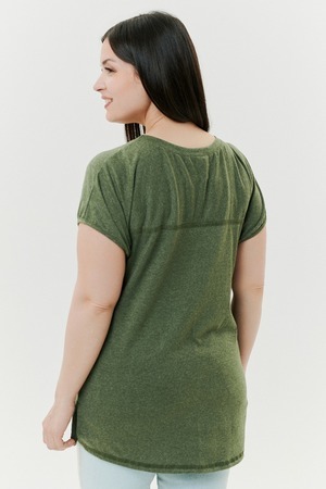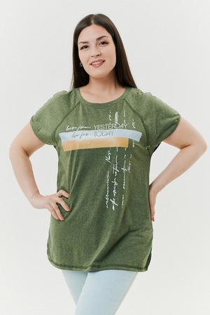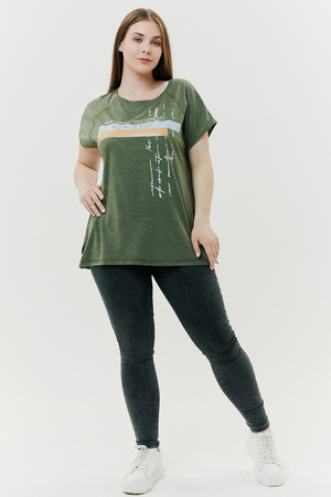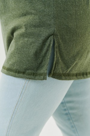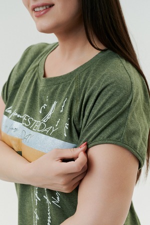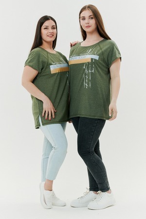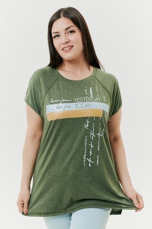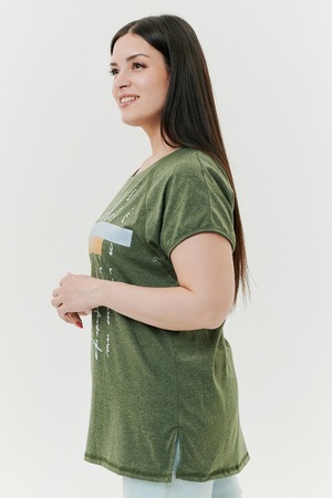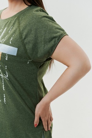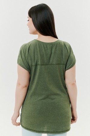 Футболка прямого силуэта, с округлой горловиной, с разрезами в нижней части боковых швов. Полочка с симметричными кокетками. Спинка с кокеткой, удлиненная. Горловина обработана обтачкой из основного полотна.