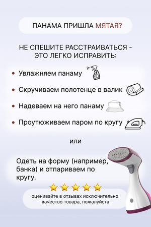 После упаковки и транспортировки панама может быть немного мятой - это легко устраняется паром или стиркой, после стирки нужно подобрать круглую форму (банка, мяч), на которую надевают изделие до полного высыхания.